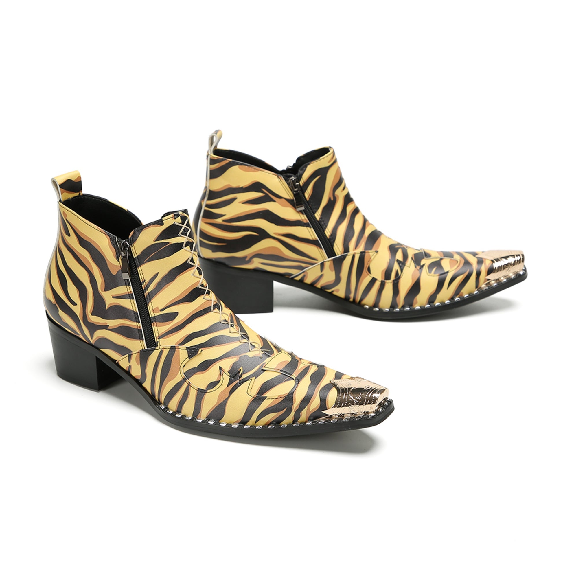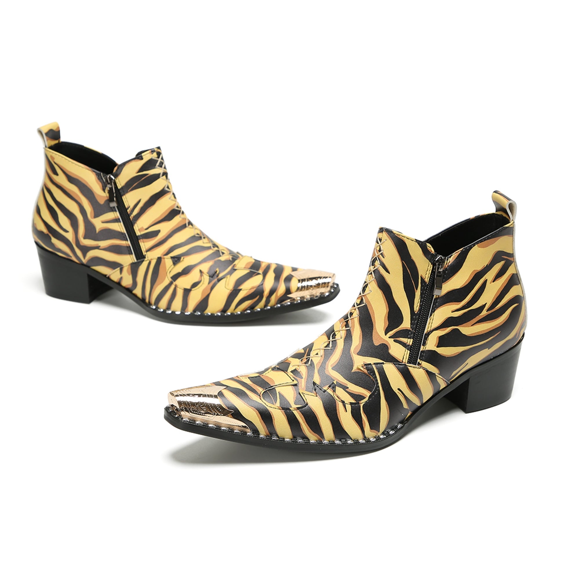 These striking ankle boots feature a vibrant tiger stripe pattern in shades of golden yellow, brown, and black, exuding a bold and exotic aesthetic. The design is accentuated by a sharply pointed toe adorned with an ornate metallic cap and a convenient side zipper for easy wear. A sturdy Cuban heel and visible stitching around the sole complete this distinctive, fashion-forward style.