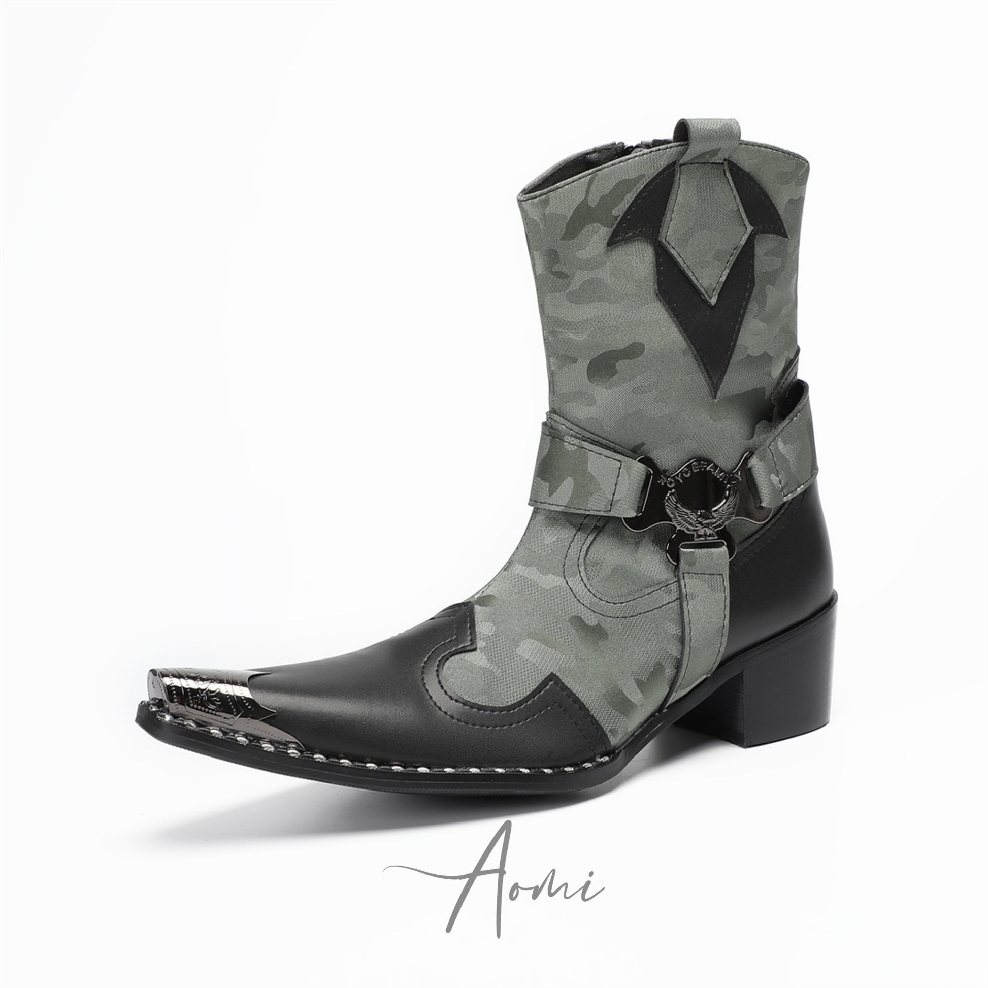 These distinctive ankle-high western boots feature a bold camouflage pattern across the shaft and upper, complemented by sleek black leather accents on the pointed toe, heel, and vamp. A prominent silver-toned metal tip adorns the sharply pointed toe, adding a rugged edge. The design is further enhanced by a functional side zipper for easy wear and an adjustable strap with a decorative metal buckle.