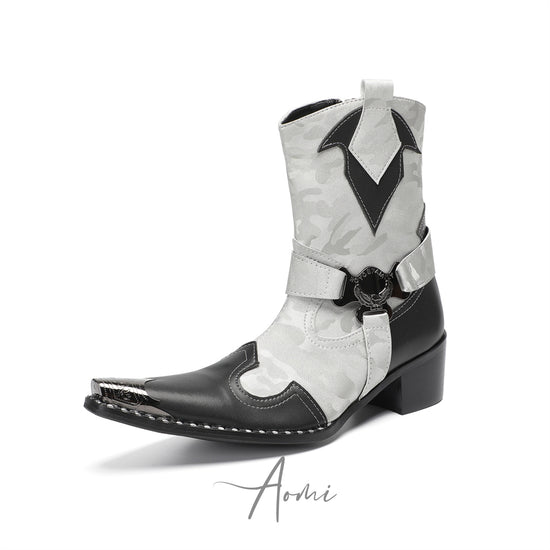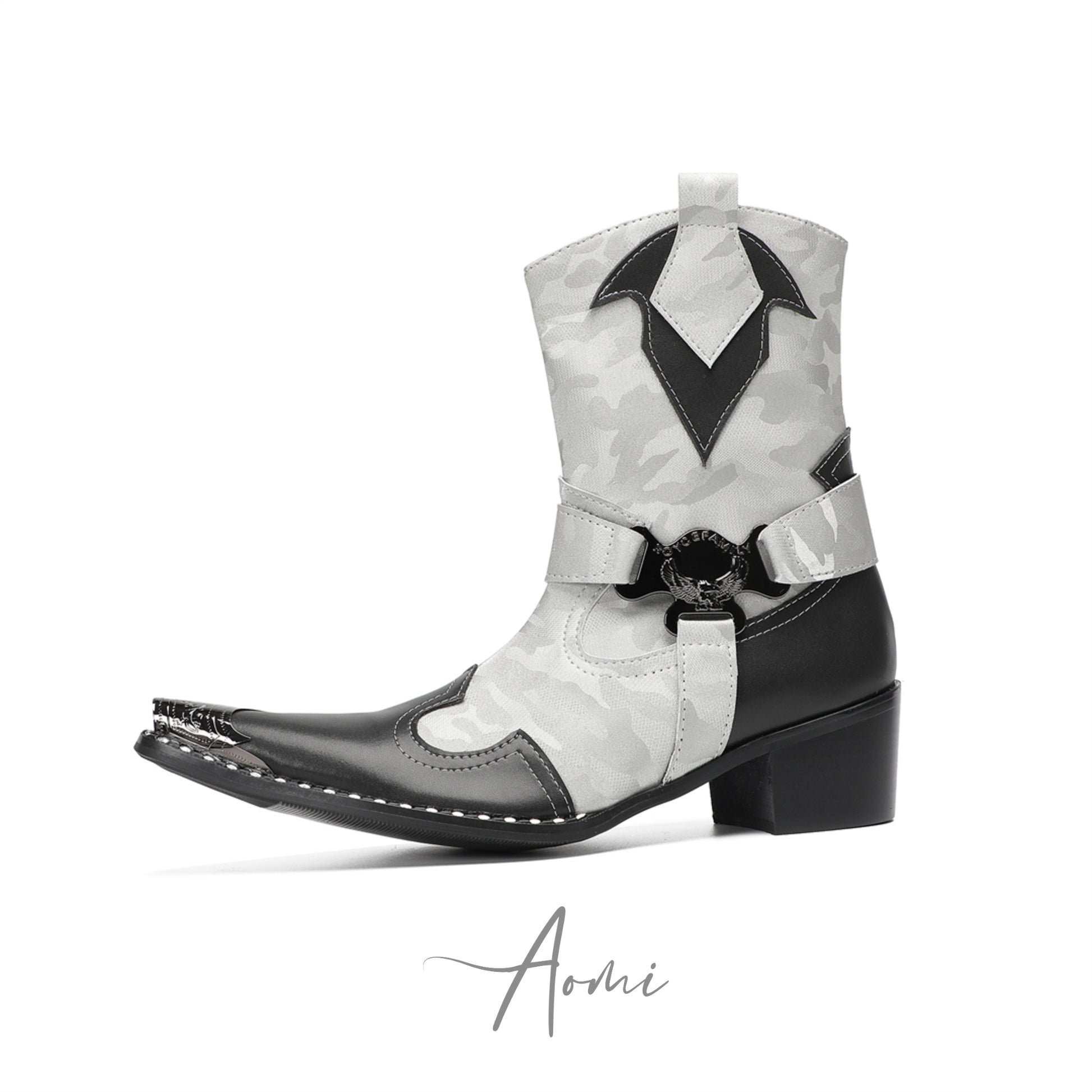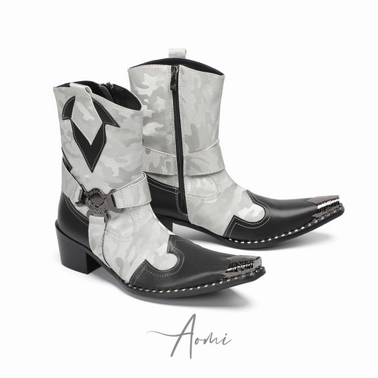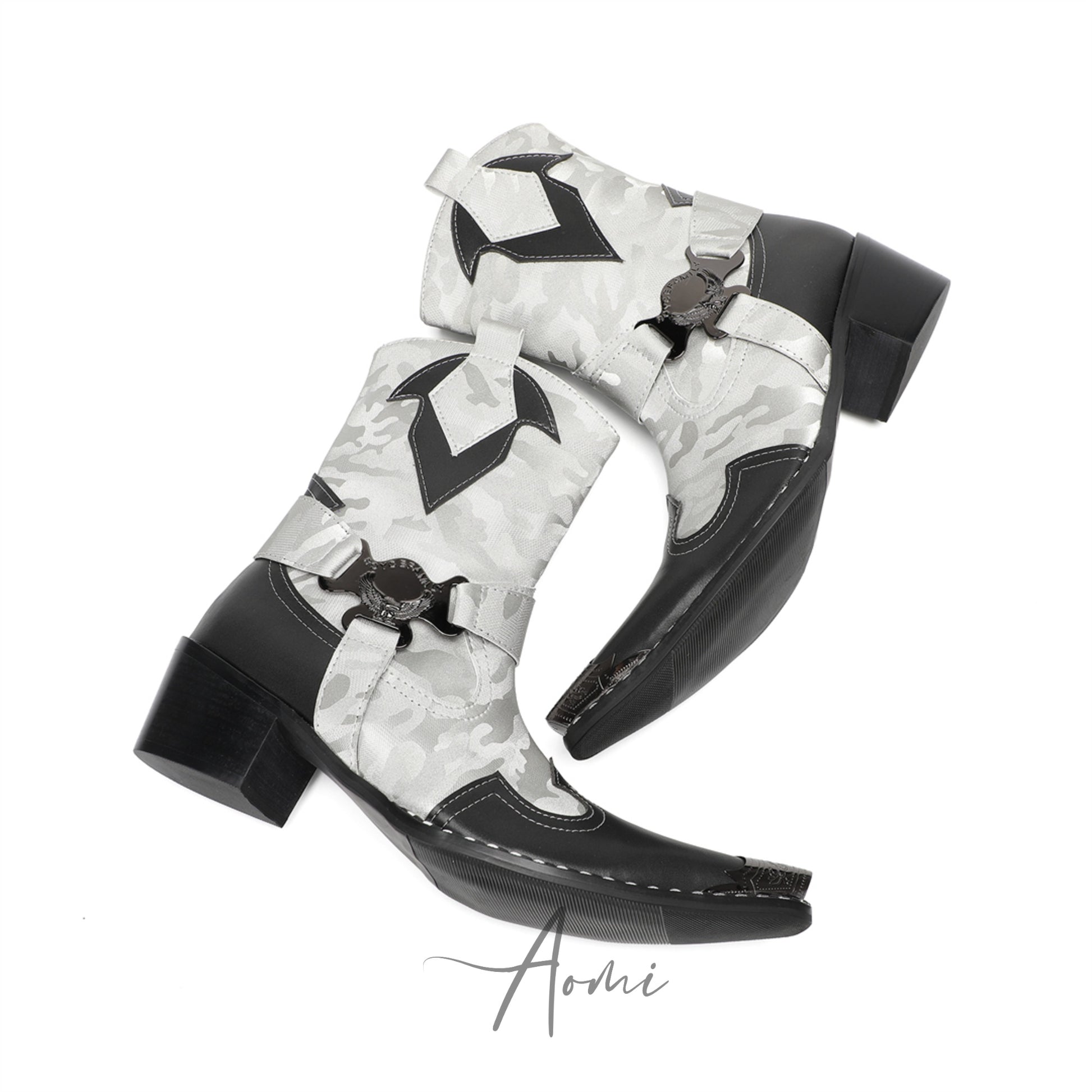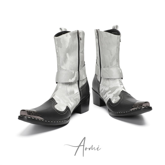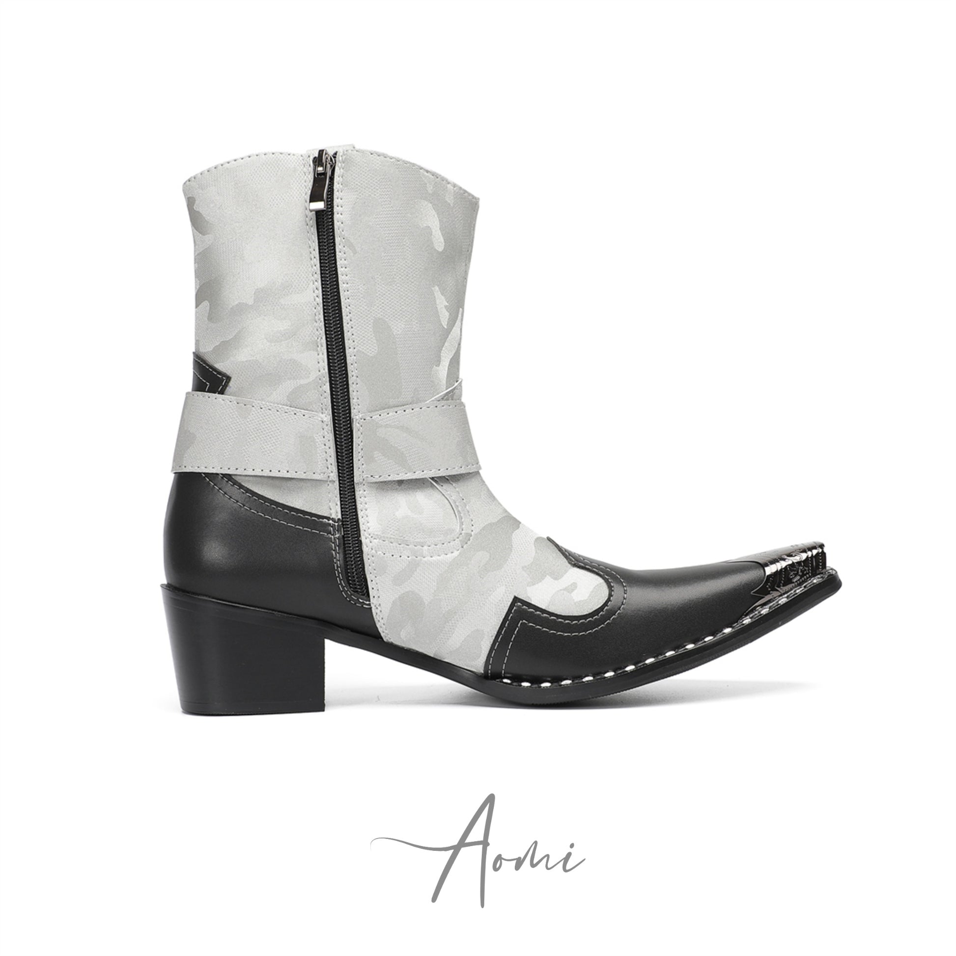 These eye-catching boots showcase a distinctive light grey and white camouflage pattern across the shaft, contrasted by sleek black leather accents on the vamp and heel. The design features traditional western-style stitching, a sharply pointed toe reinforced with a prominent silver-toned metal tip, and a convenient side zipper for easy wear. A decorative strap with a prominent buckle wraps around the ankle, adding to its rugged yet stylish aesthetic, complemented by a sturdy block heel.