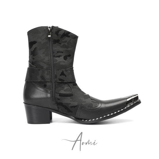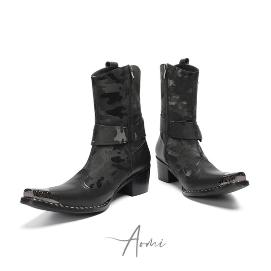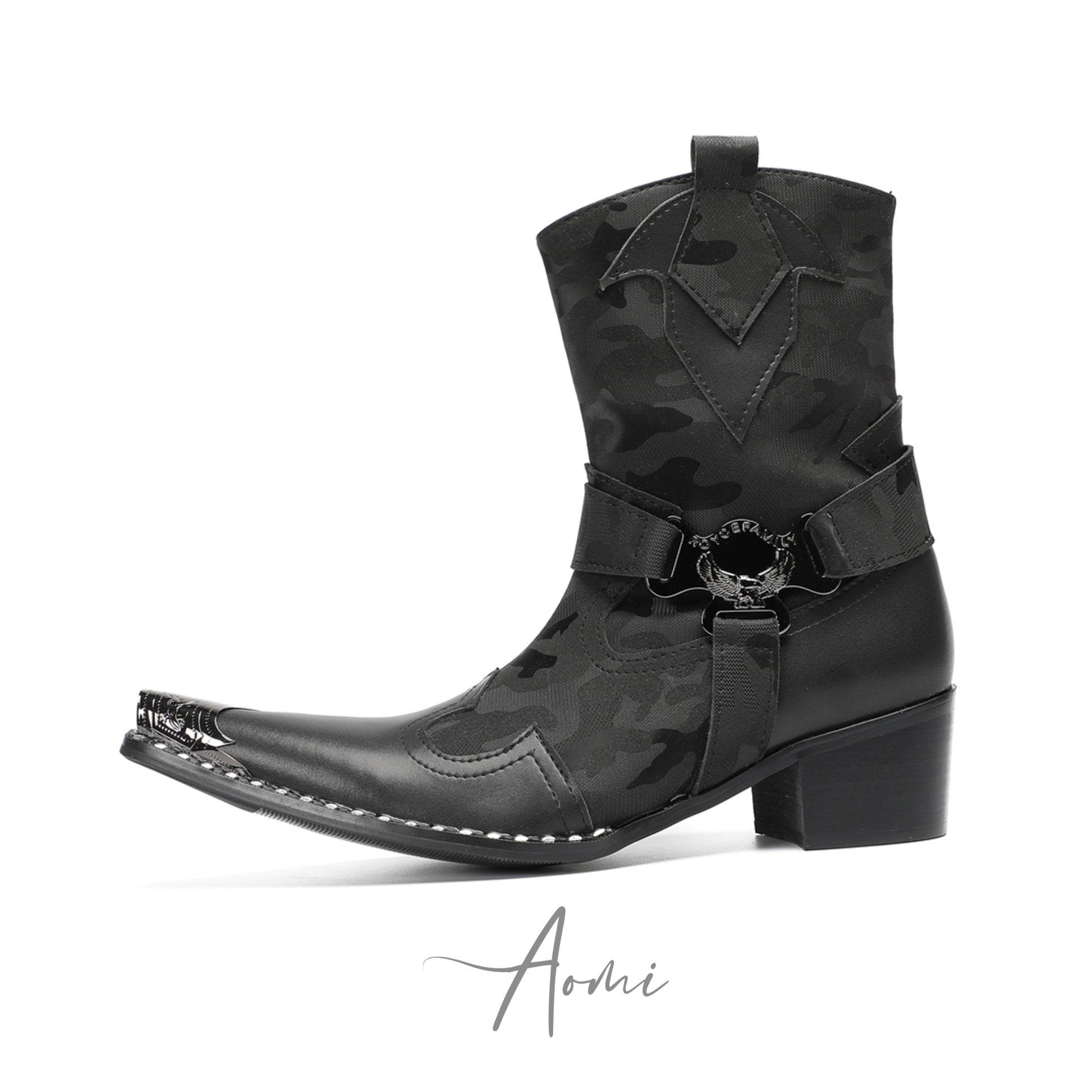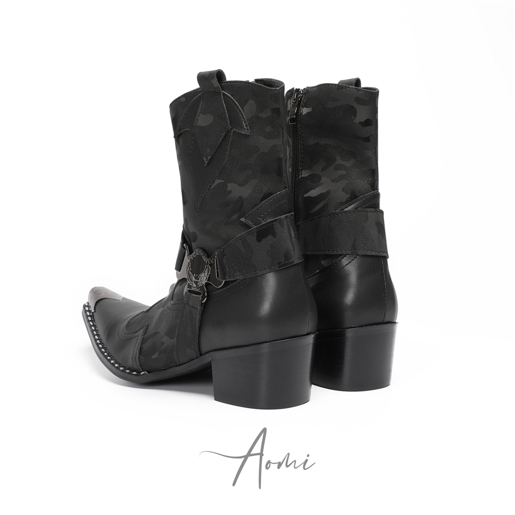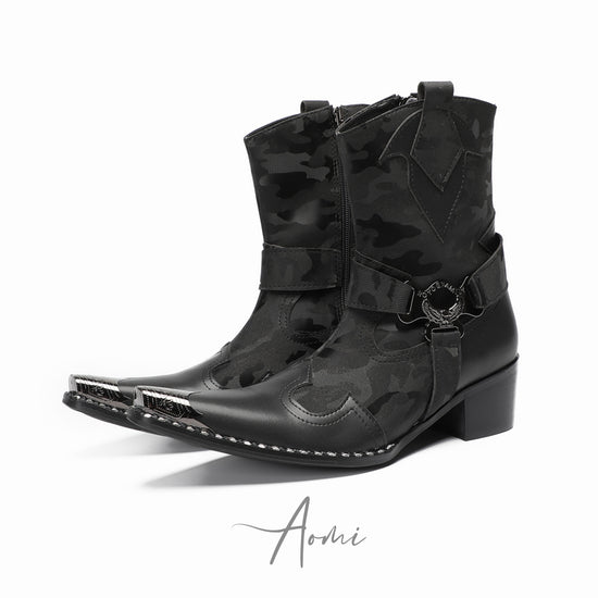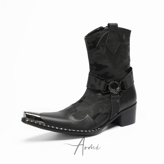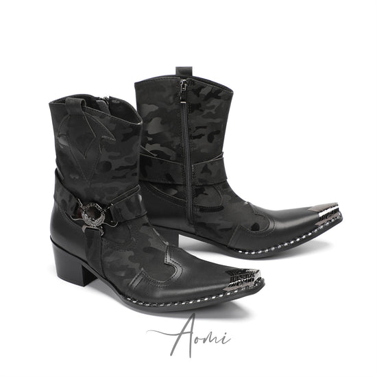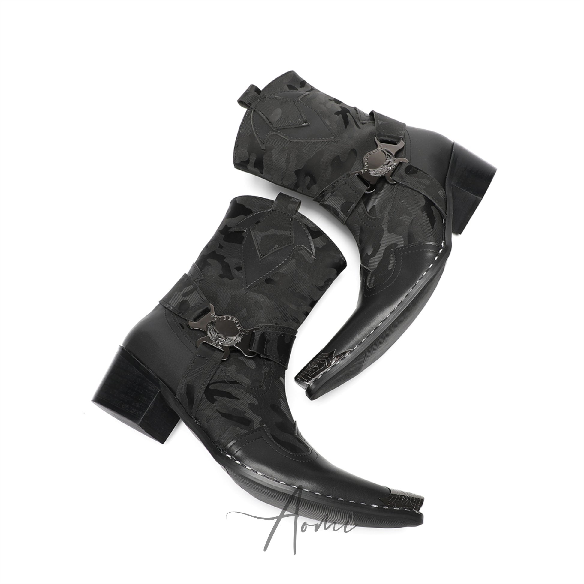 These eye-catching men's ankle boots blend rugged Western style with contemporary urban edge. They feature a sleek black leather foot section contrasting with a dark, subtle camouflage patterned textile shaft. Distinguishing elements include a sharp pointed toe adorned with a prominent silver metal tip, a decorative strap with an ornate buckle, a practical side zipper, and a sturdy block heel, all complemented by silver stud detailing along the sole for an enhanced rock-inspired aesthetic.