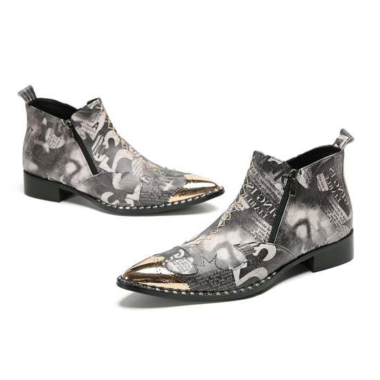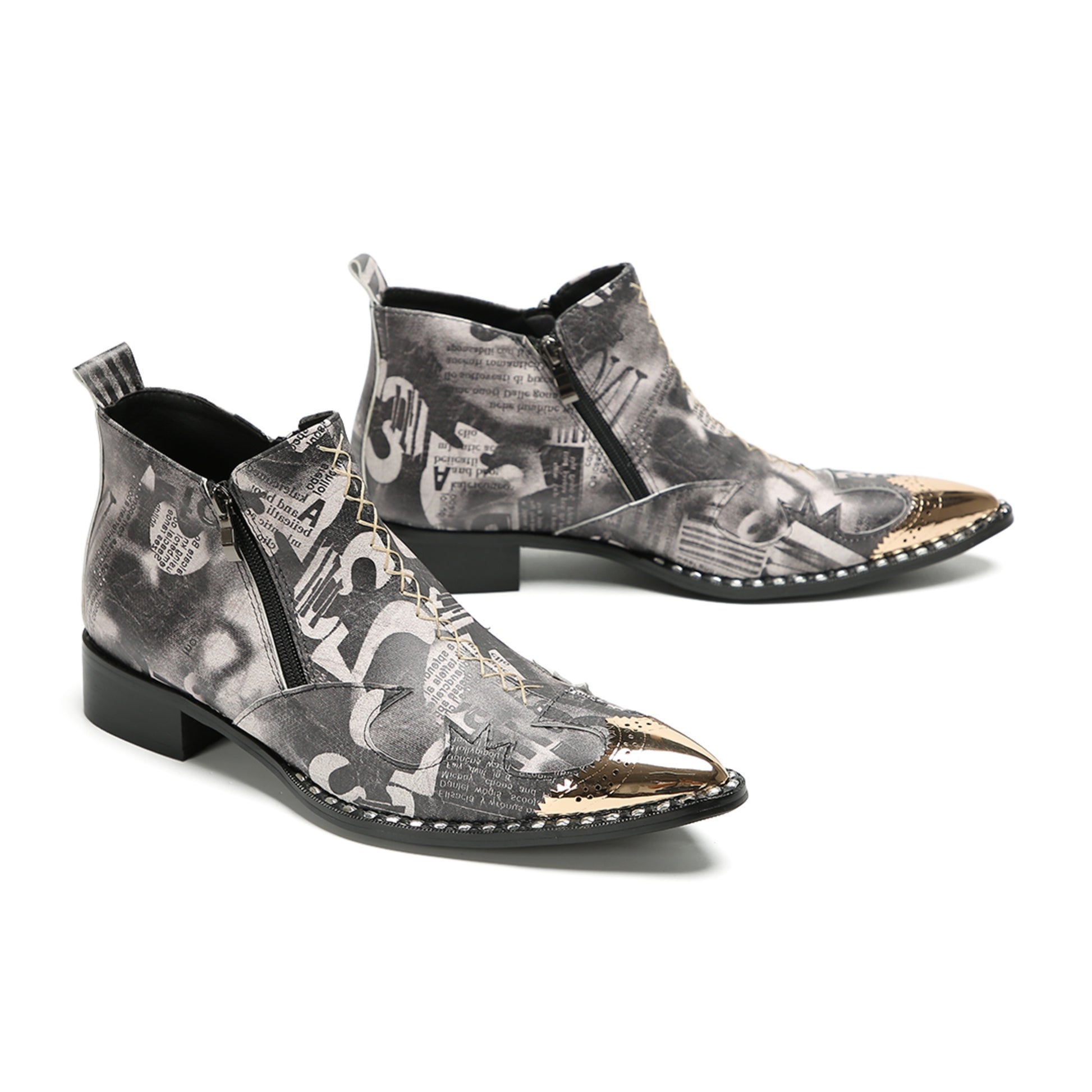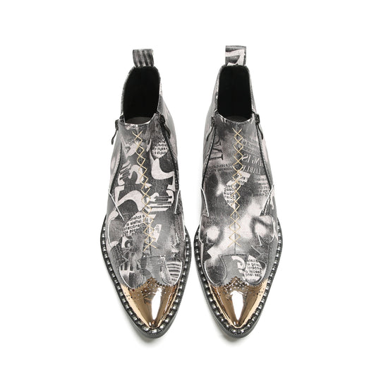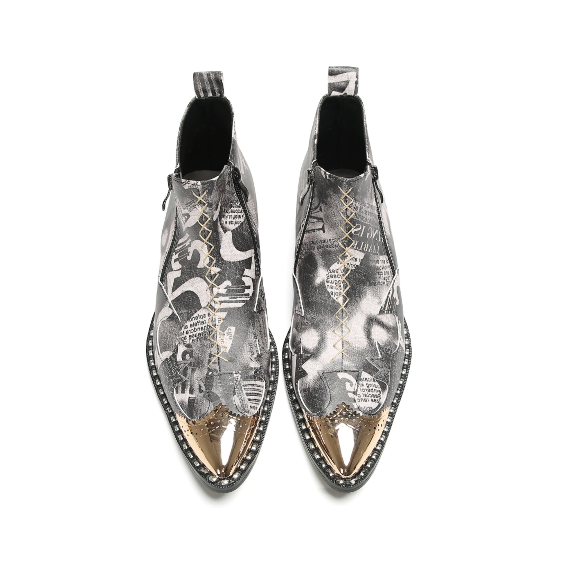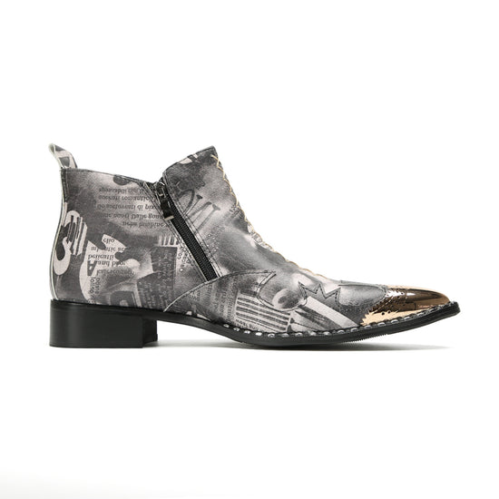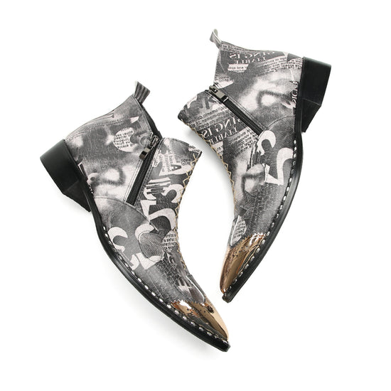 These eye-catching ankle boots feature a unique black and white newspaper print pattern, offering a distinctive street fashion appeal. Crafted with a sleek, pointed toe, they are enhanced by a striking gold metal tip and decorative gold-toned stitching across the vamp. A convenient side zipper closure and a low block heel complete the edgy, contemporary design.