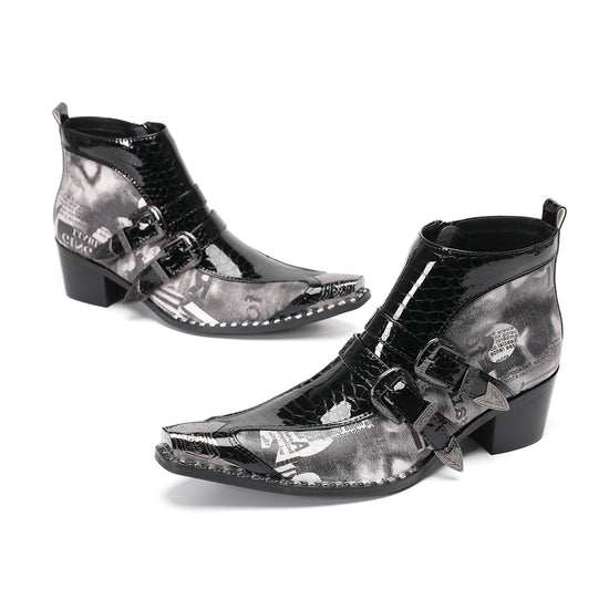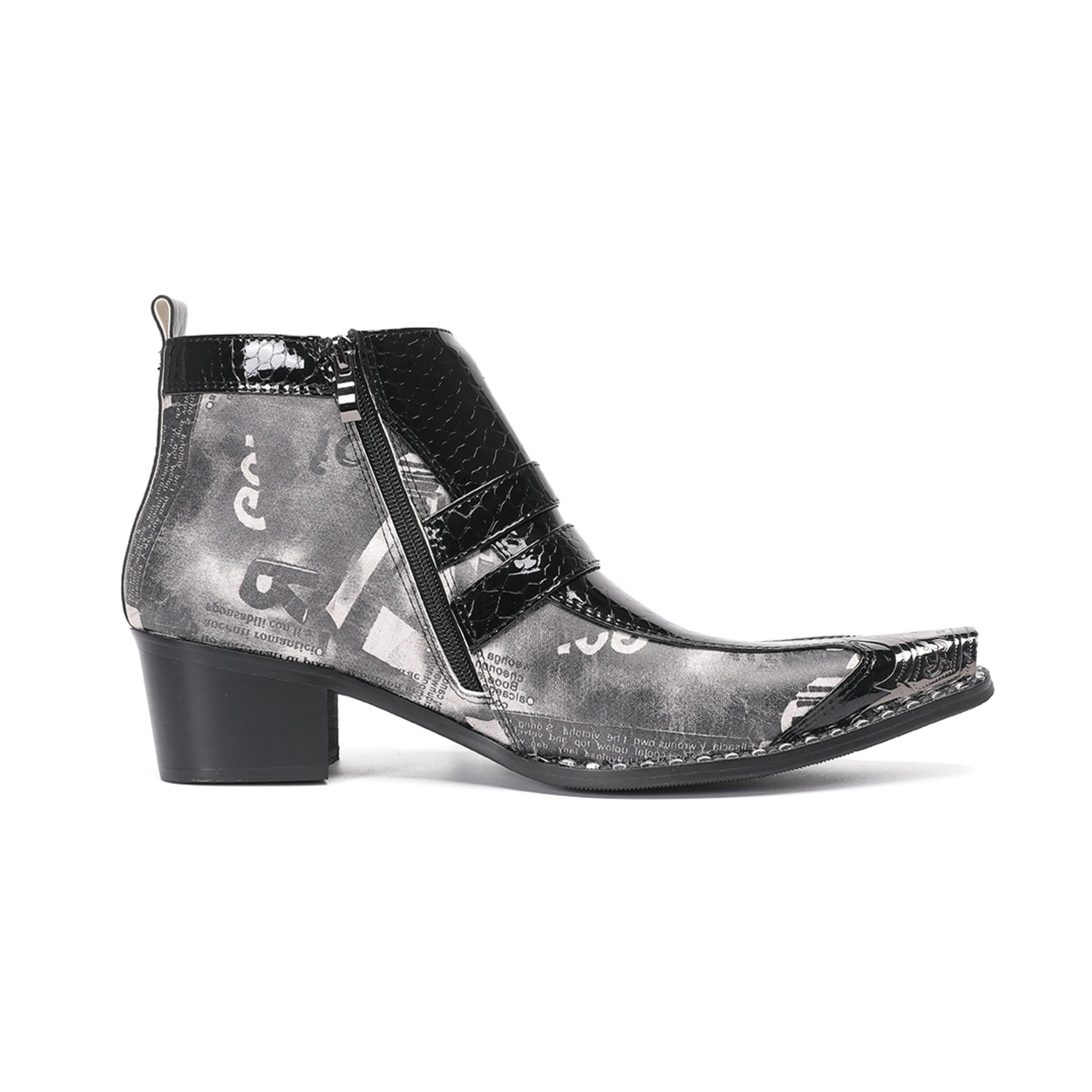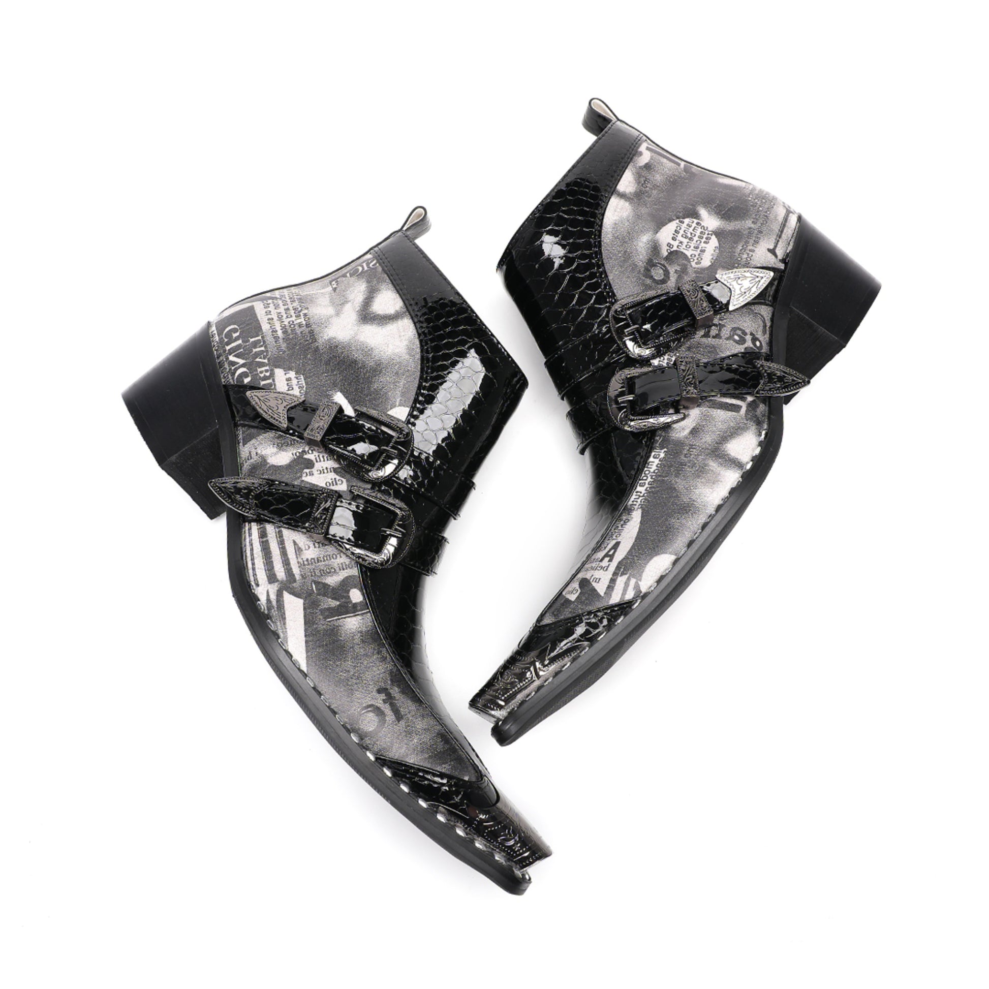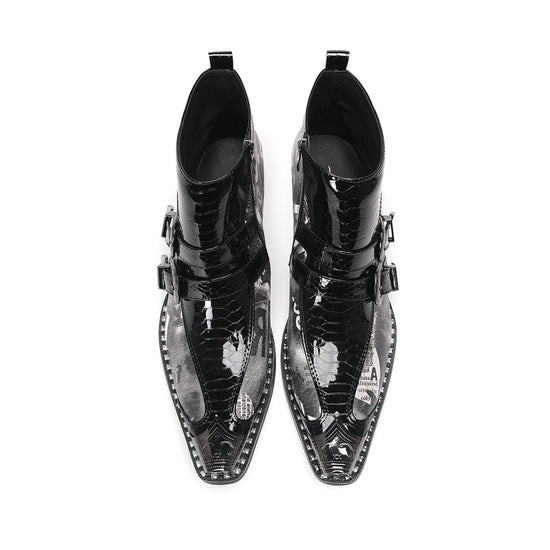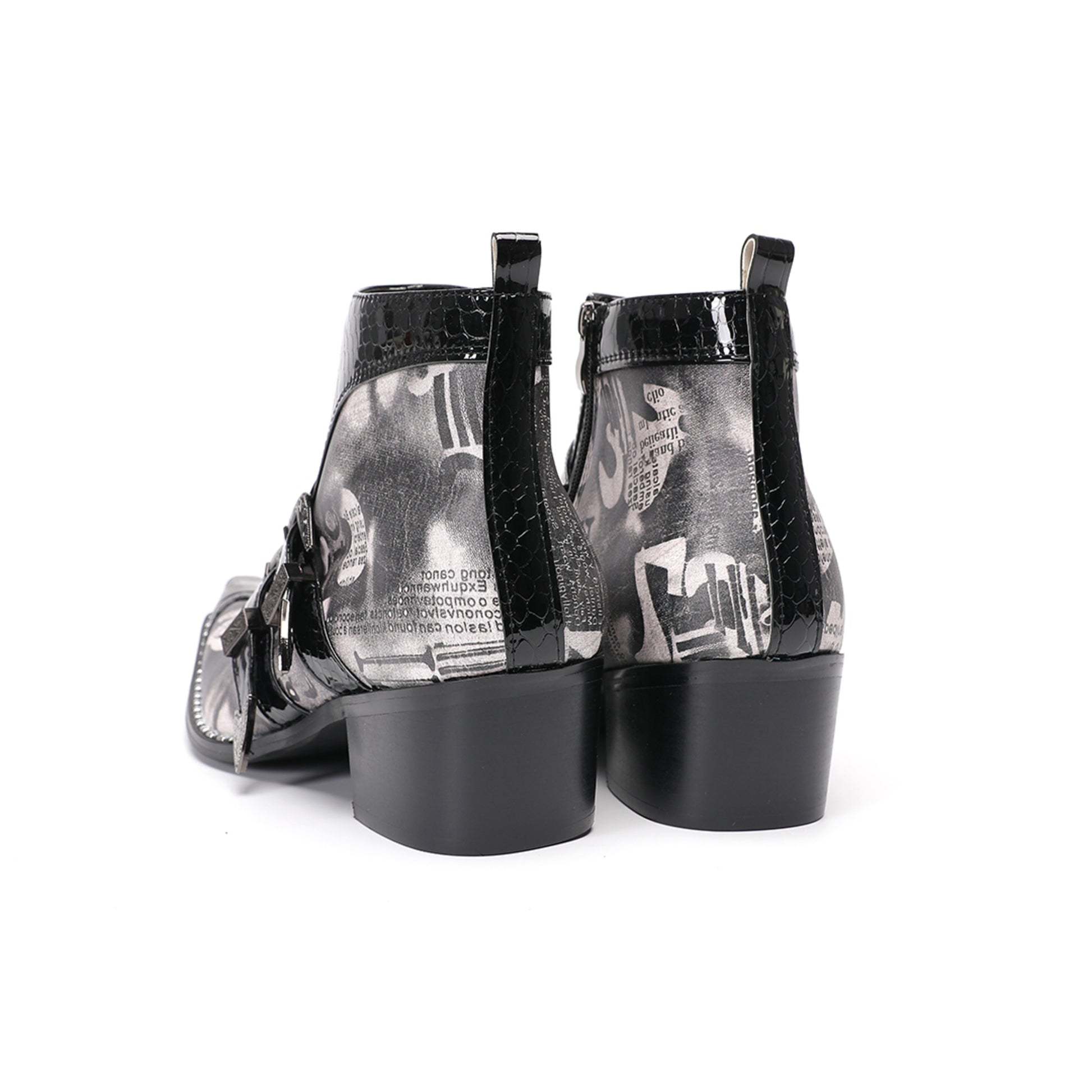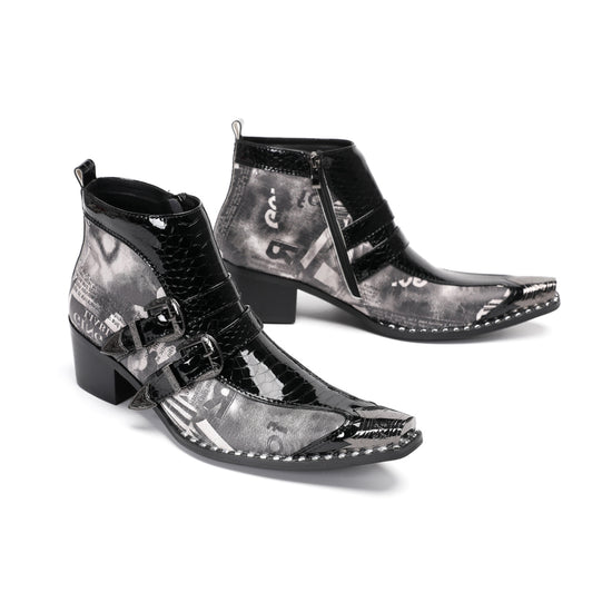 This men's ankle boot features a striking design, combining a distressed, newspaper-like print on the main shaft with shiny, black patent leather accents. The patent sections, including the sharply pointed toe and crisscrossing buckle straps, exhibit a subtle crocodile or snakeskin texture, adding a luxurious yet edgy contrast. Two prominent silver-toned buckles adorn the vamp, enhancing the punk-rock aesthetic, while a convenient side zipper ensures easy wear. The boot is completed with a sturdy block heel, contributing to its distinct and bold silhouette.
