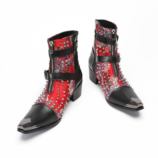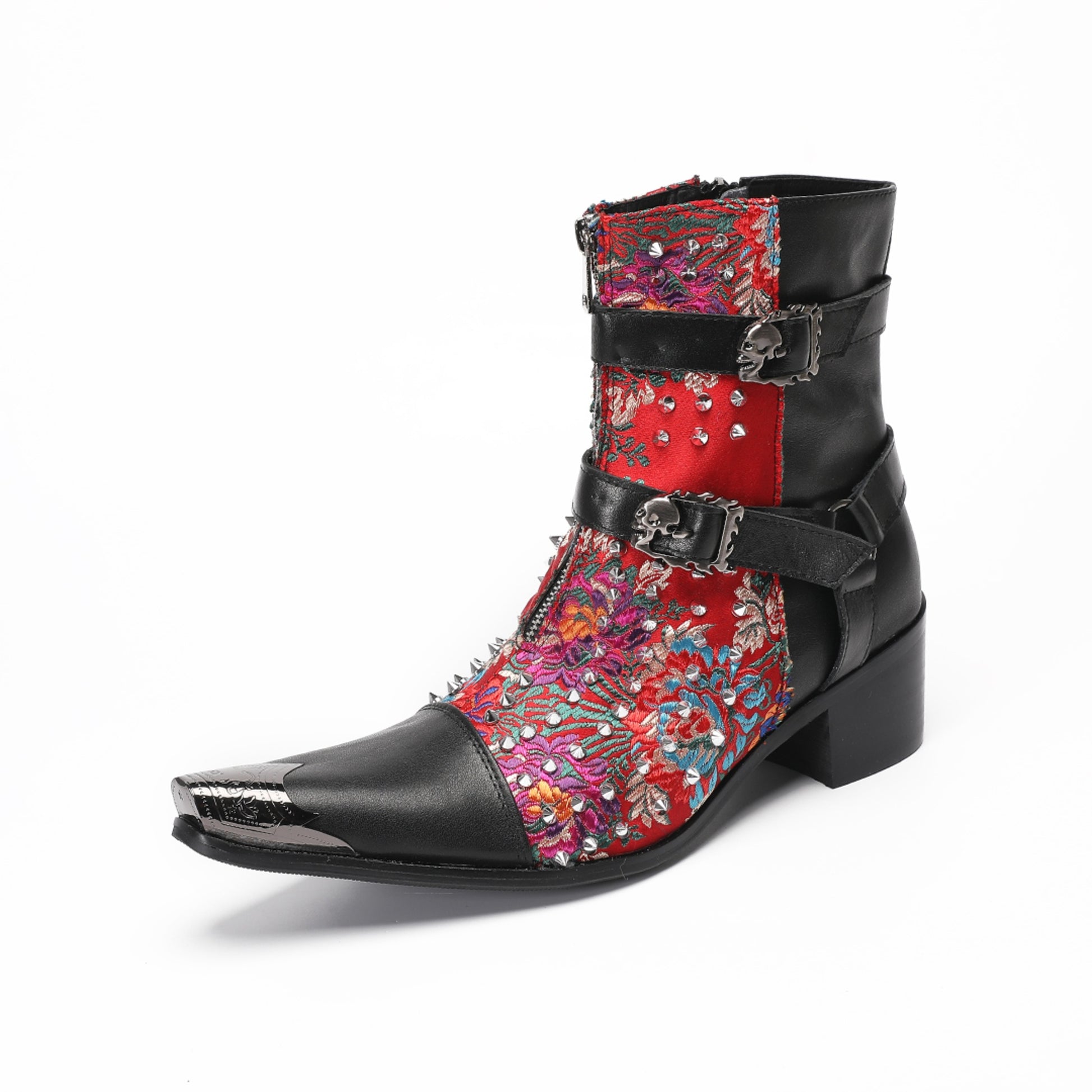 These striking ankle boots feature a vibrant red fabric upper adorned with an intricate, multi-colored floral and paisley pattern. The rich textile is heavily embellished with silver-toned spikes and studs, creating a bold, edgy texture. Contrasting black leather panels wrap around the heel, ankle, and toe, which is accented with a sharp, polished metal tip, further enhancing its distinctive punk-rock aesthetic. Two decorative buckle straps with skull details and a functional side zipper complete the design.