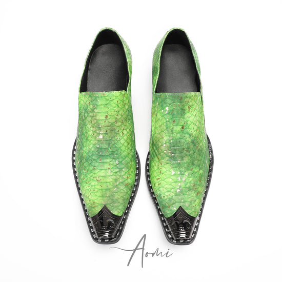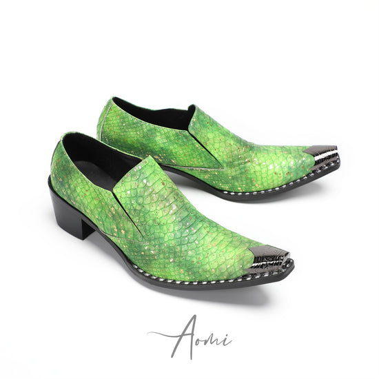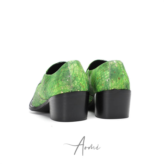 These striking slip-on dress shoes feature a vibrant green upper adorned with a detailed reptilian skin pattern, accentuated by subtle golden speckles throughout. The sharp pointed toe is capped with a sleek, engraved metal tip, adding an edgy, sophisticated touch. Finished with a sturdy block heel, these shoes exude a bold and fashion-forward aesthetic.
