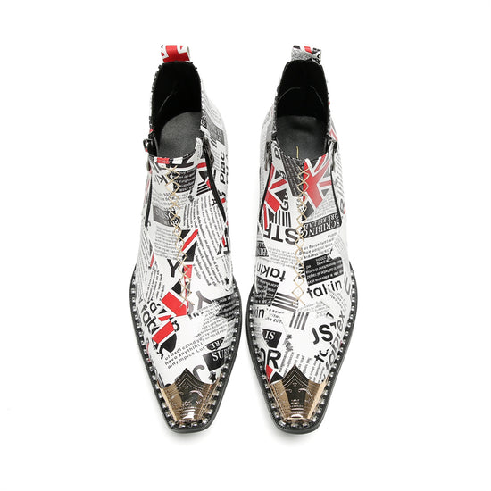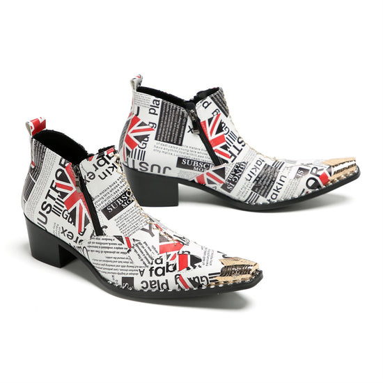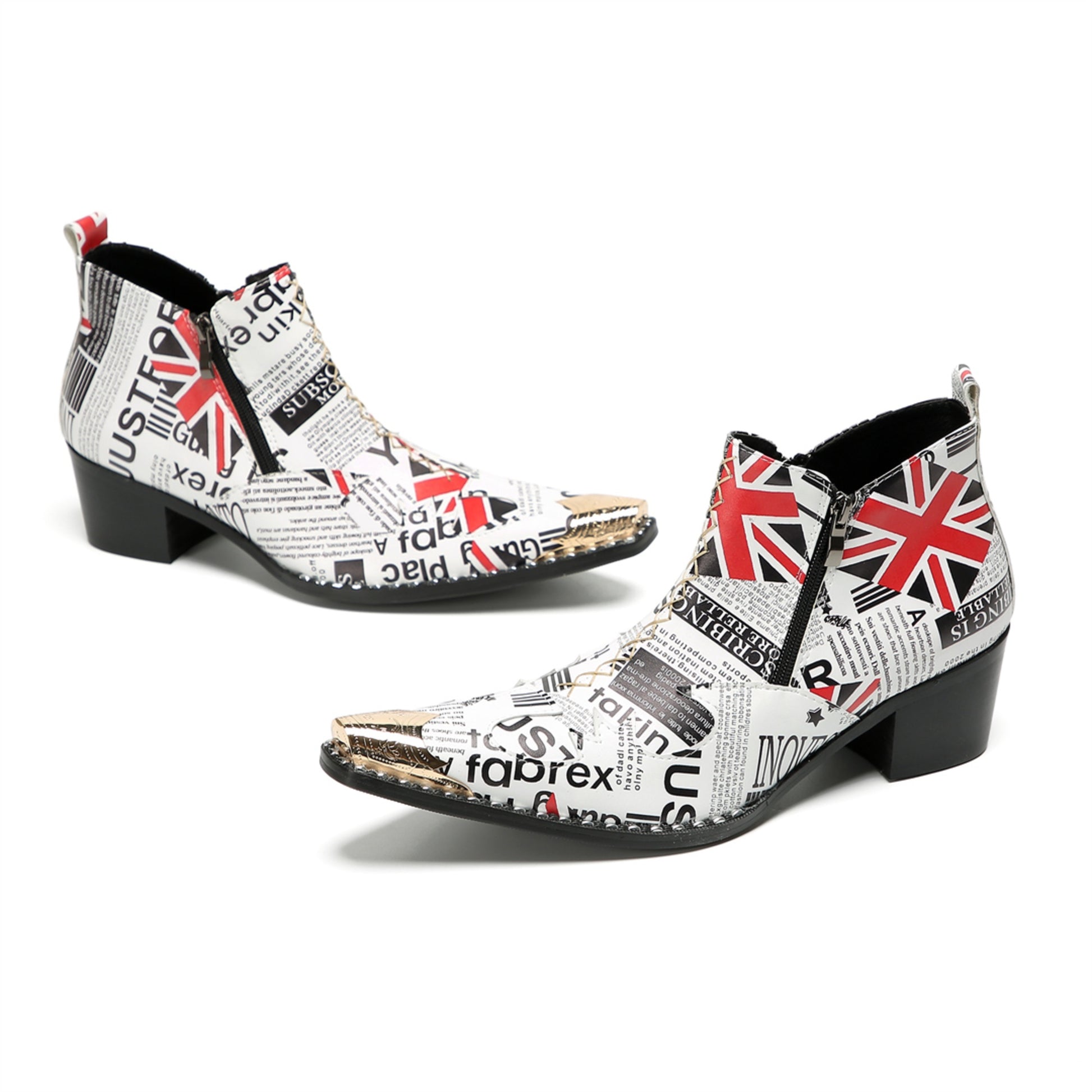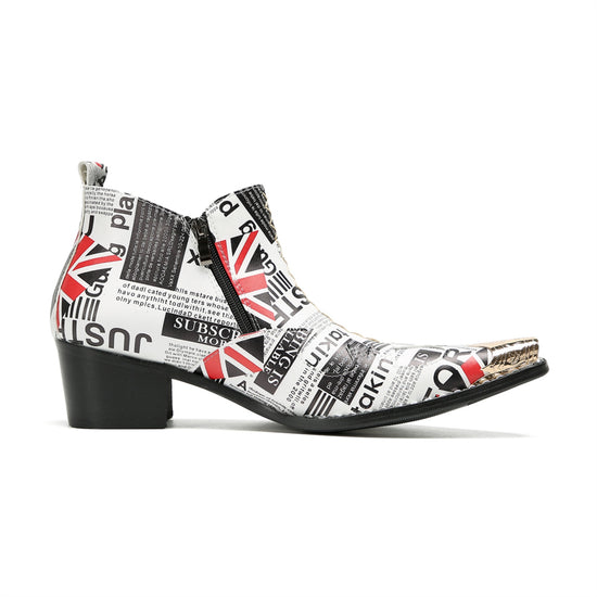 These eye-catching ankle boots feature a unique newspaper print pattern across the entire upper, punctuated by bold red and black Union Jack flag motifs. They are crafted with a sleek pointed toe, enhanced by a striking gold-toned metal cap. The design is completed with a practical inner side zipper closure and a sturdy block heel, offering an edgy yet refined silhouette.