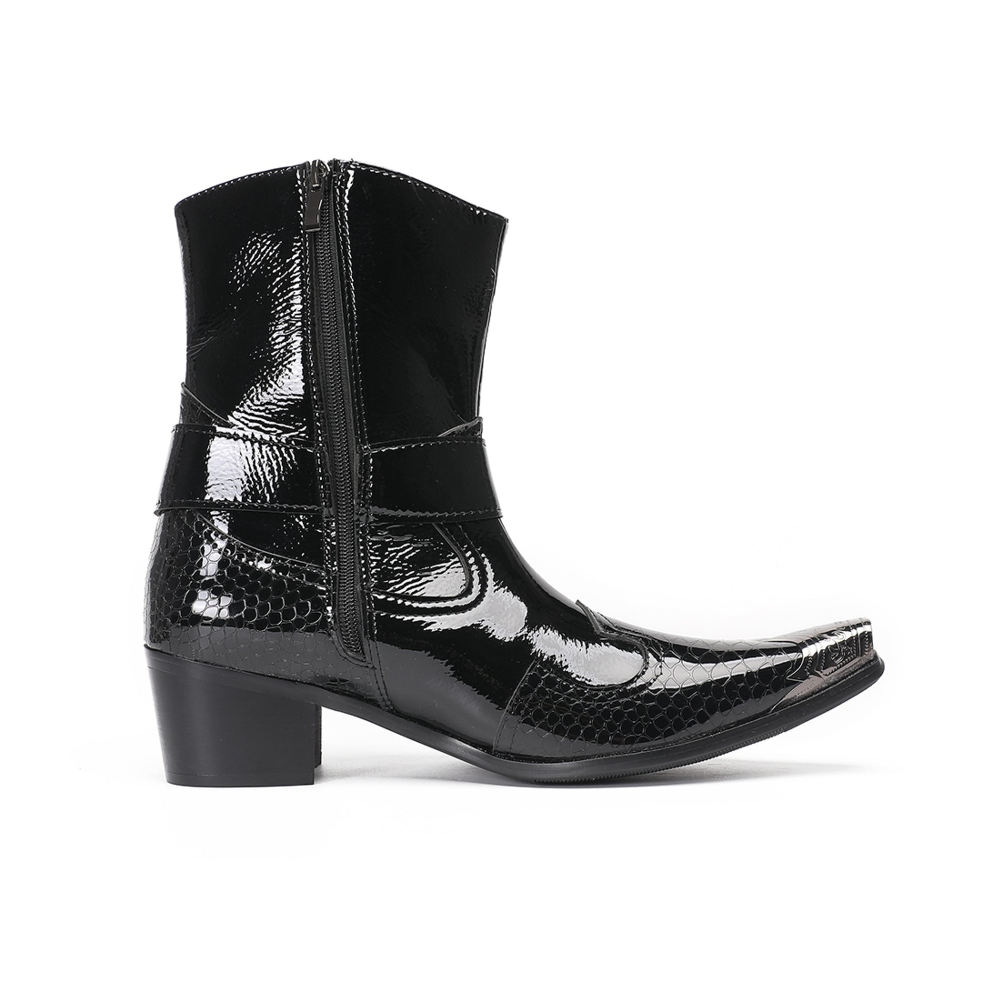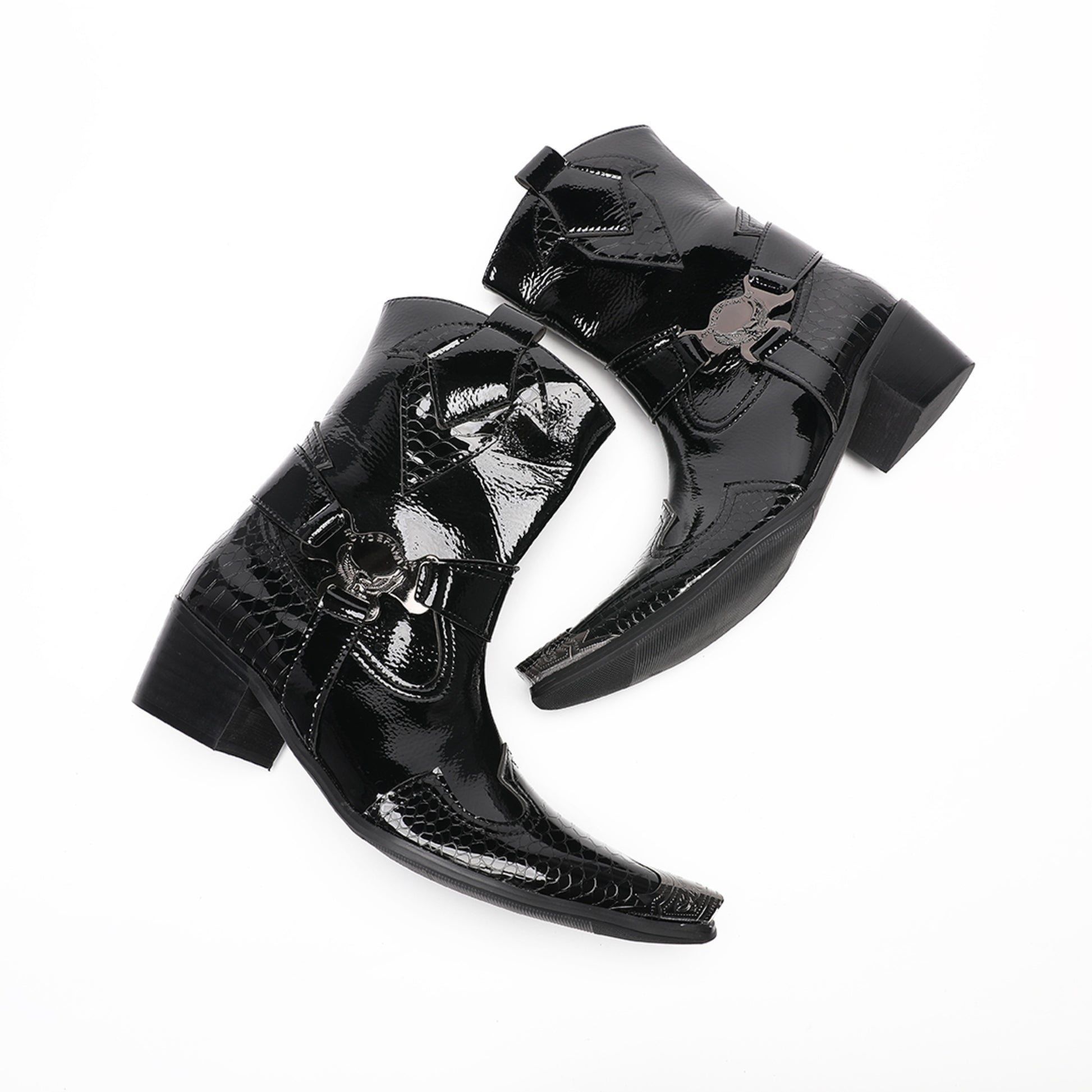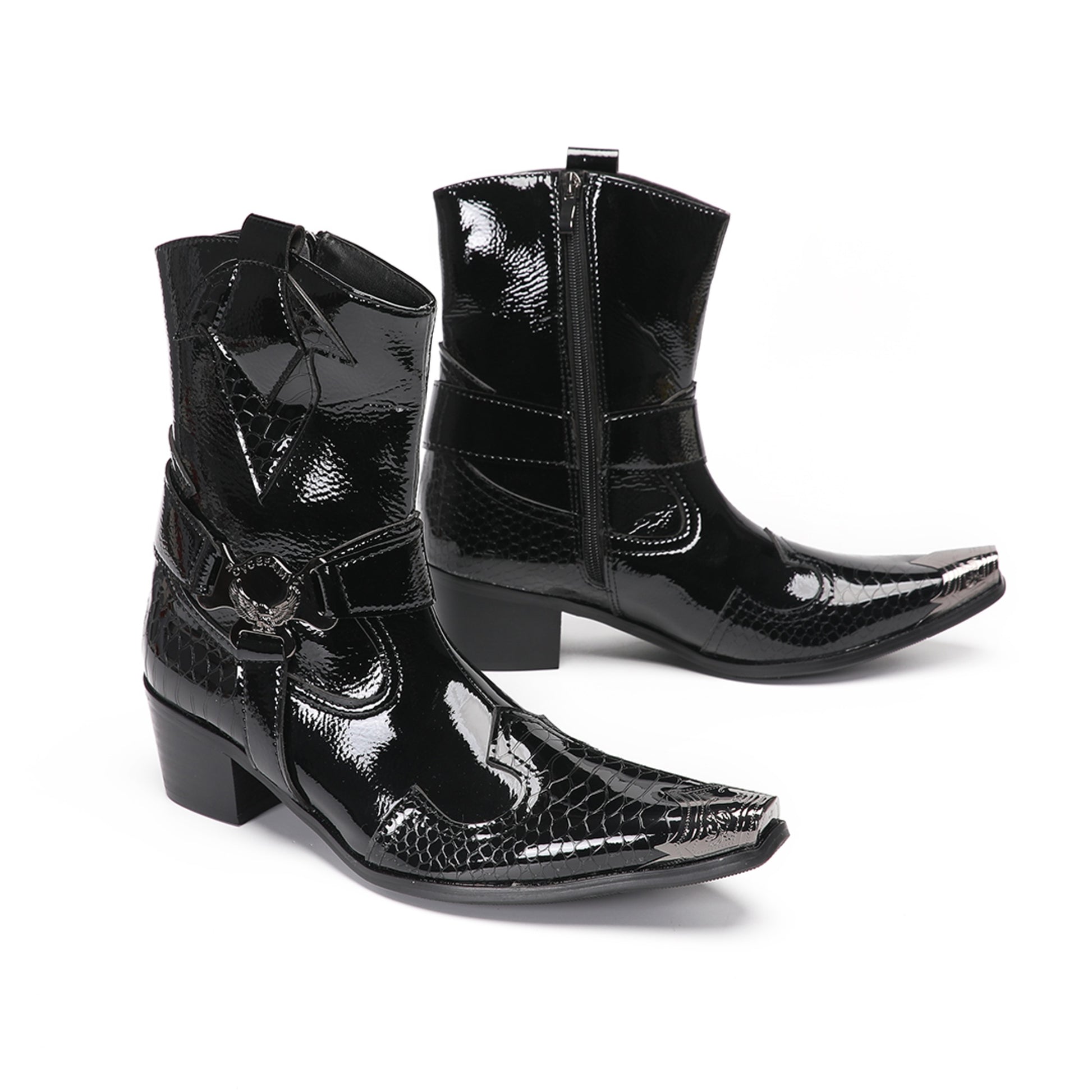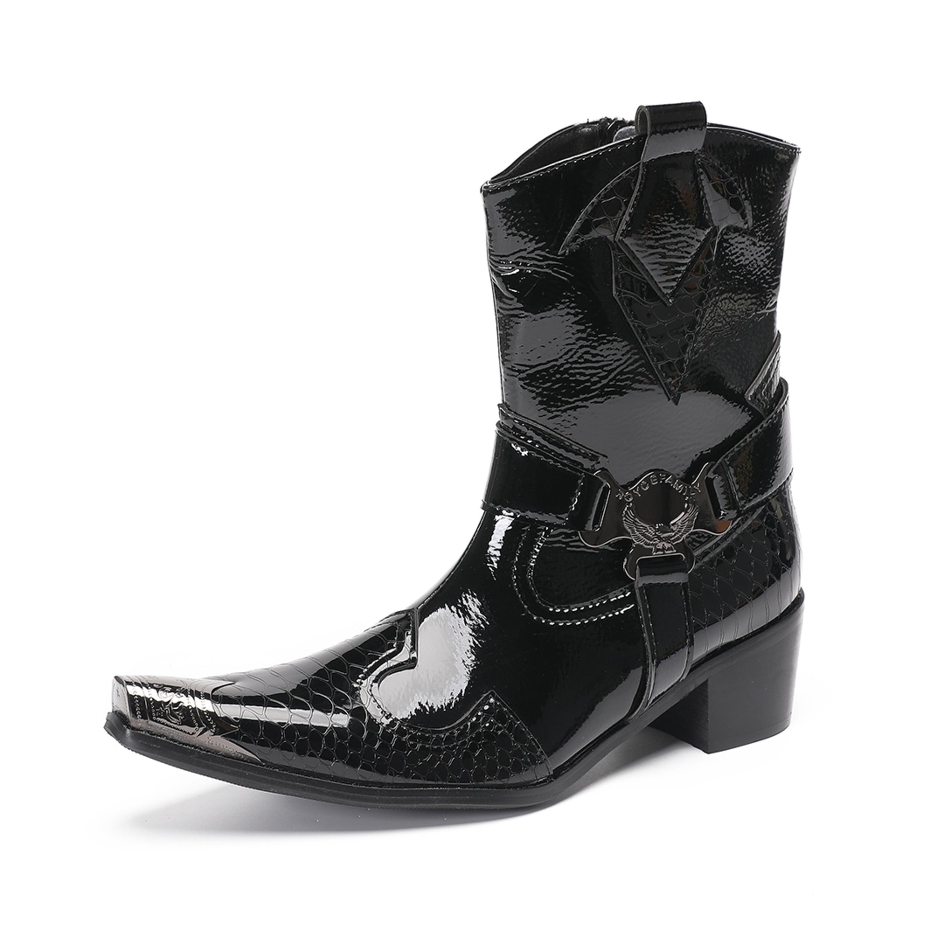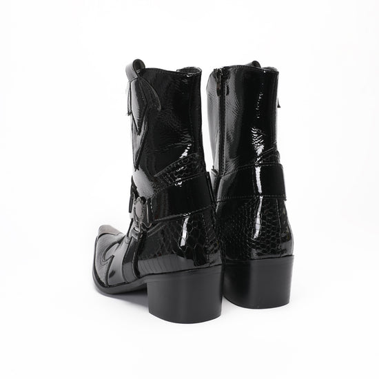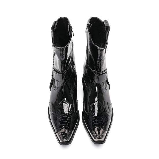 These men's Western boots are crafted with a striking combination of glossy patent leather and textured crocodile-embossed panels, creating a luxurious and edgy aesthetic. They feature a sharp pointed toe adorned with a polished silver-tone metal tip, a decorative strap with a prominent O-ring buckle, and a block heel, embodying a distinctive cowboy style with a modern, formal flair.