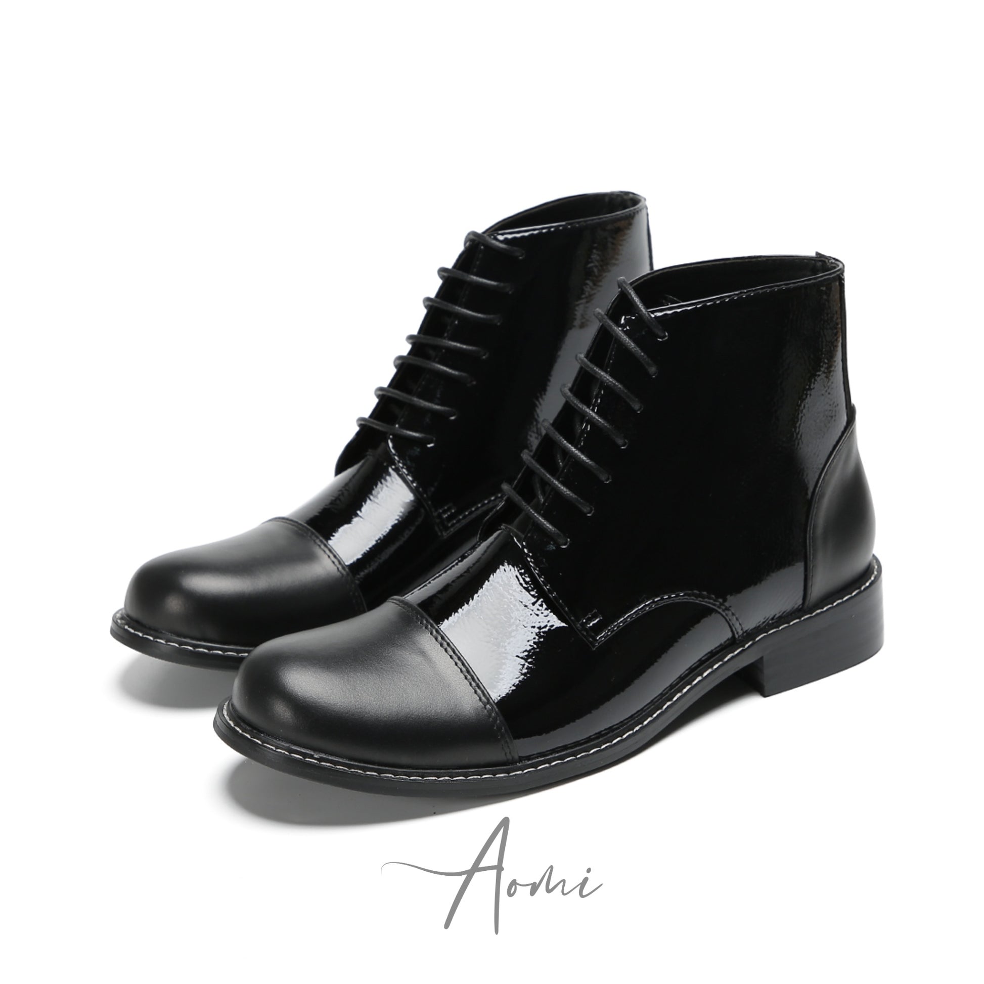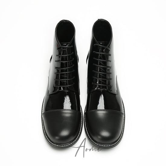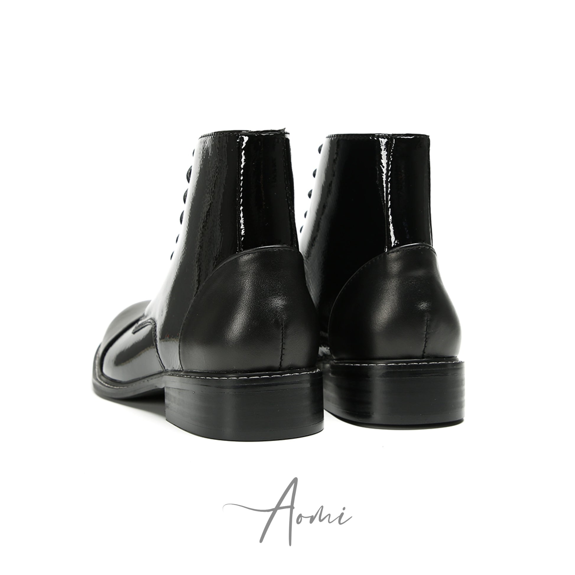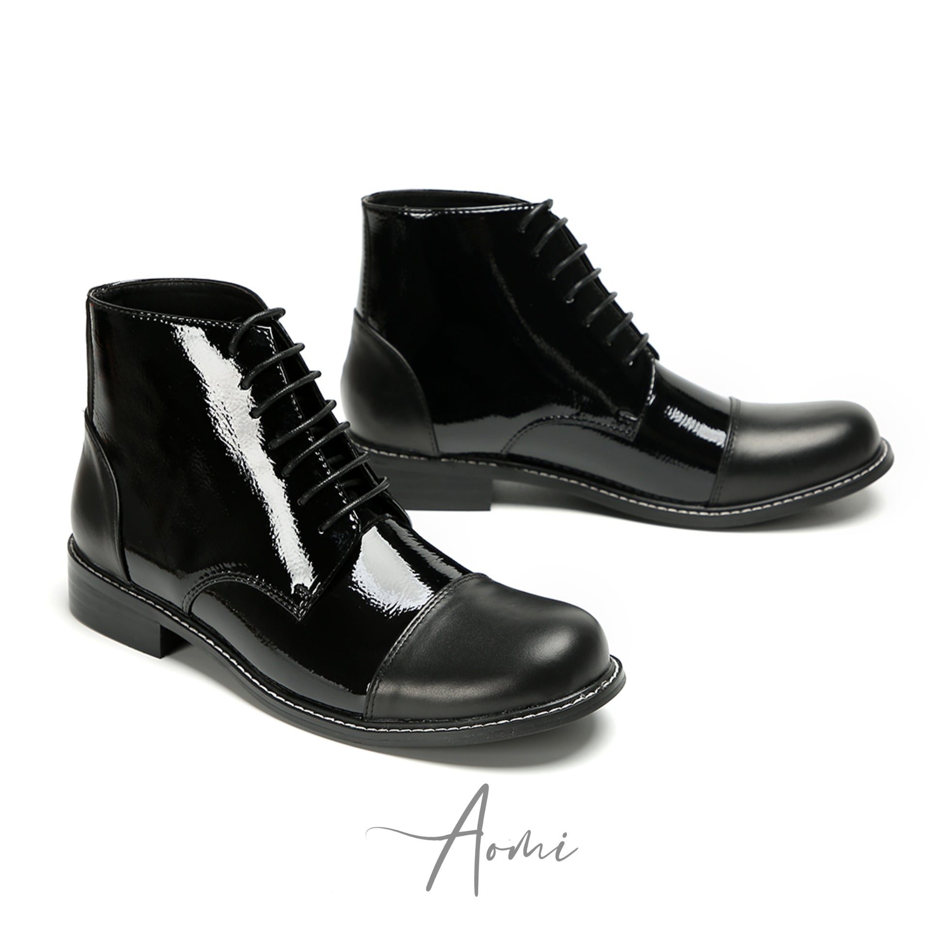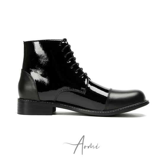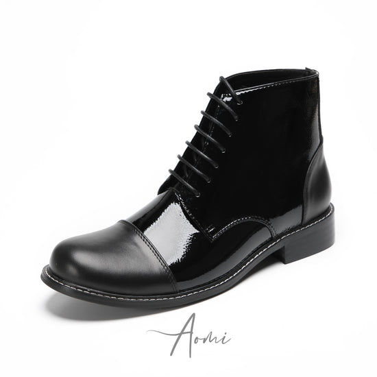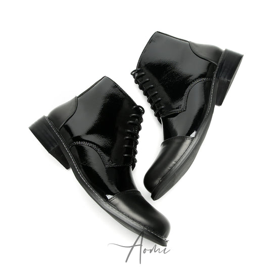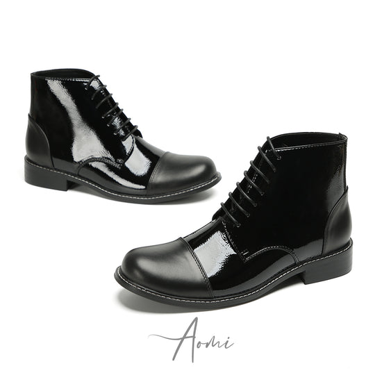 These elegant ankle boots showcase a striking two-tone material design, featuring a glossy patent leather finish across the main body and vamp, contrasted with a smooth, matte leather cap-toe and heel counter. The lace-up front provides a classic and adjustable fit, complemented by subtle white stitching along the welt. Their sleek, round-toe silhouette and low stacked heel offer a refined yet versatile style.