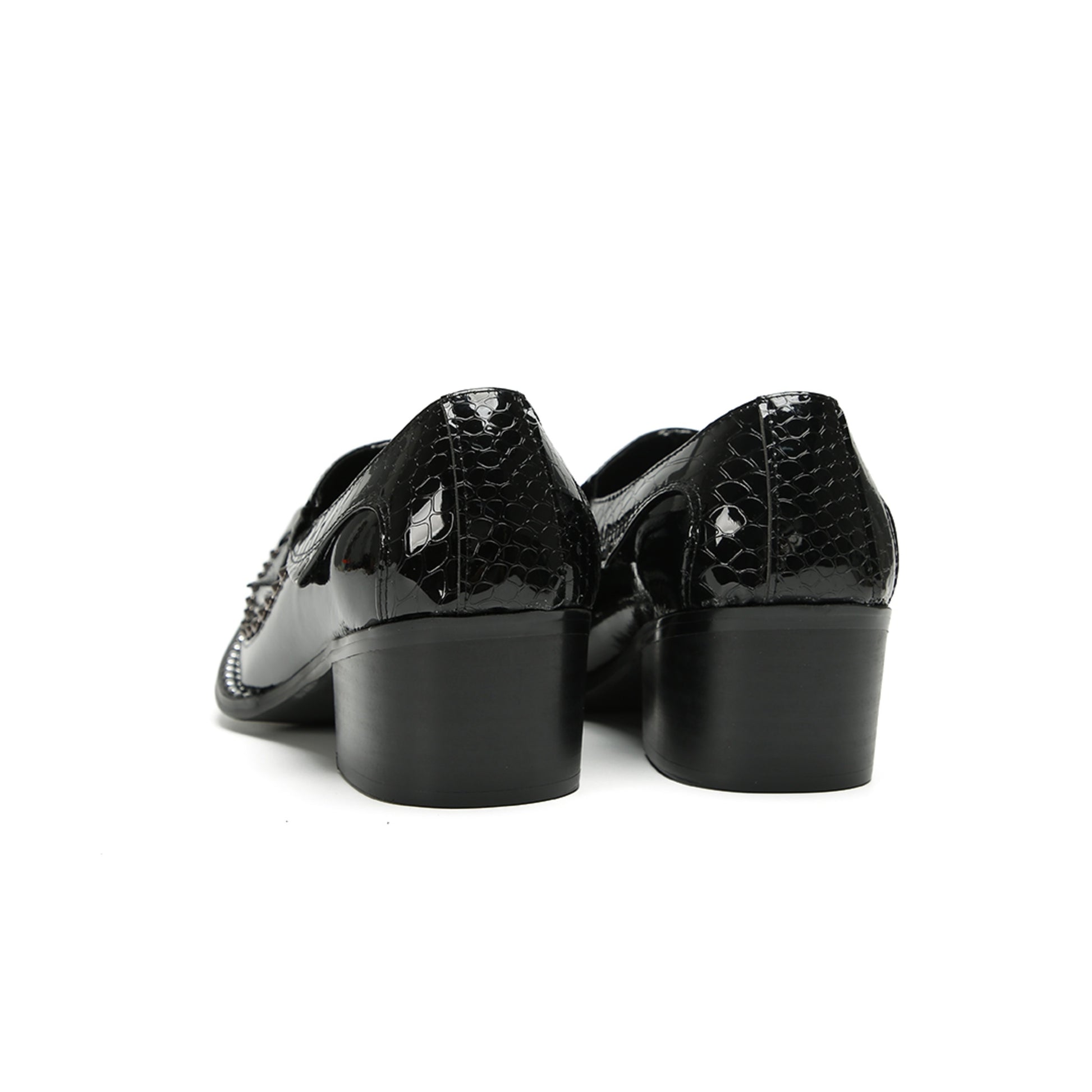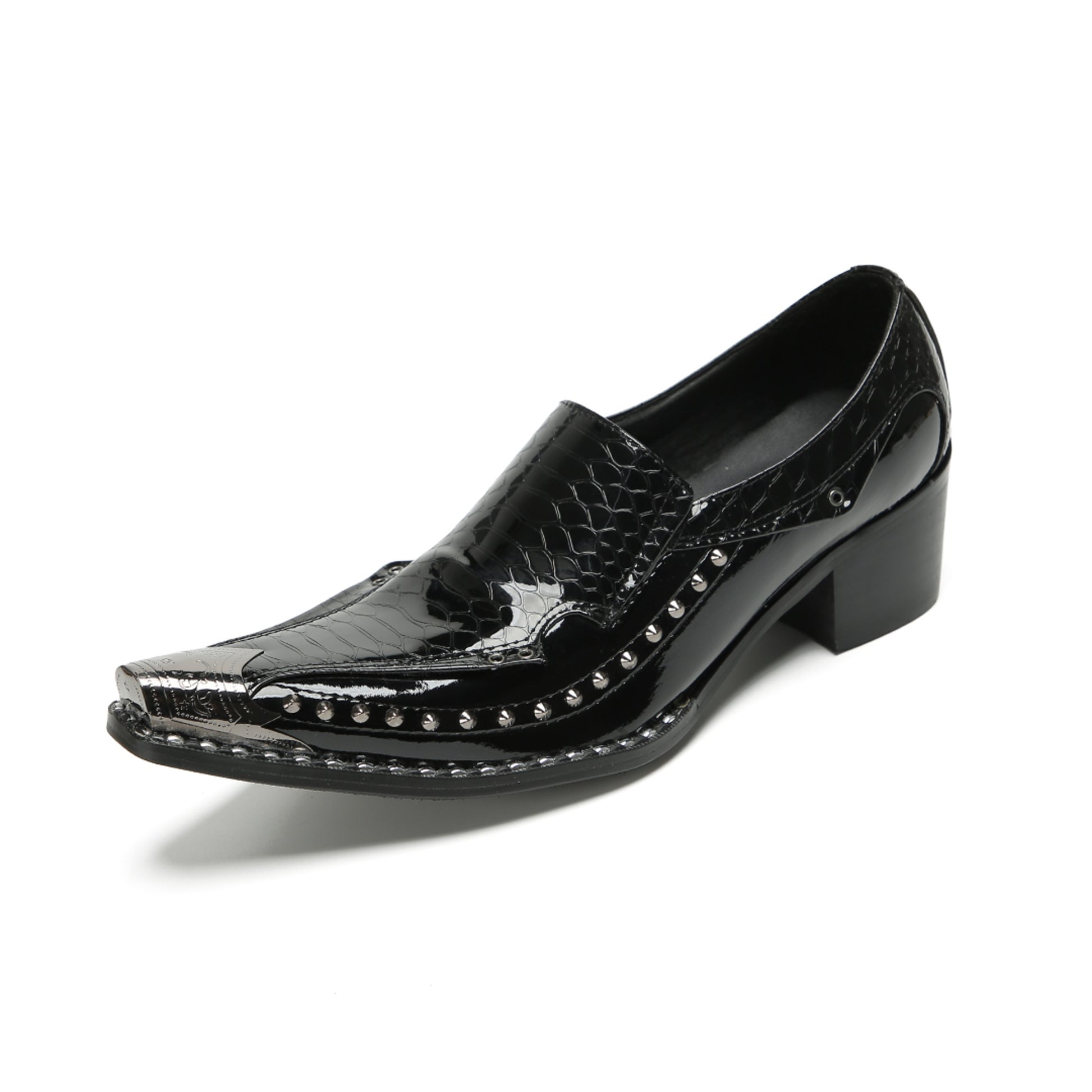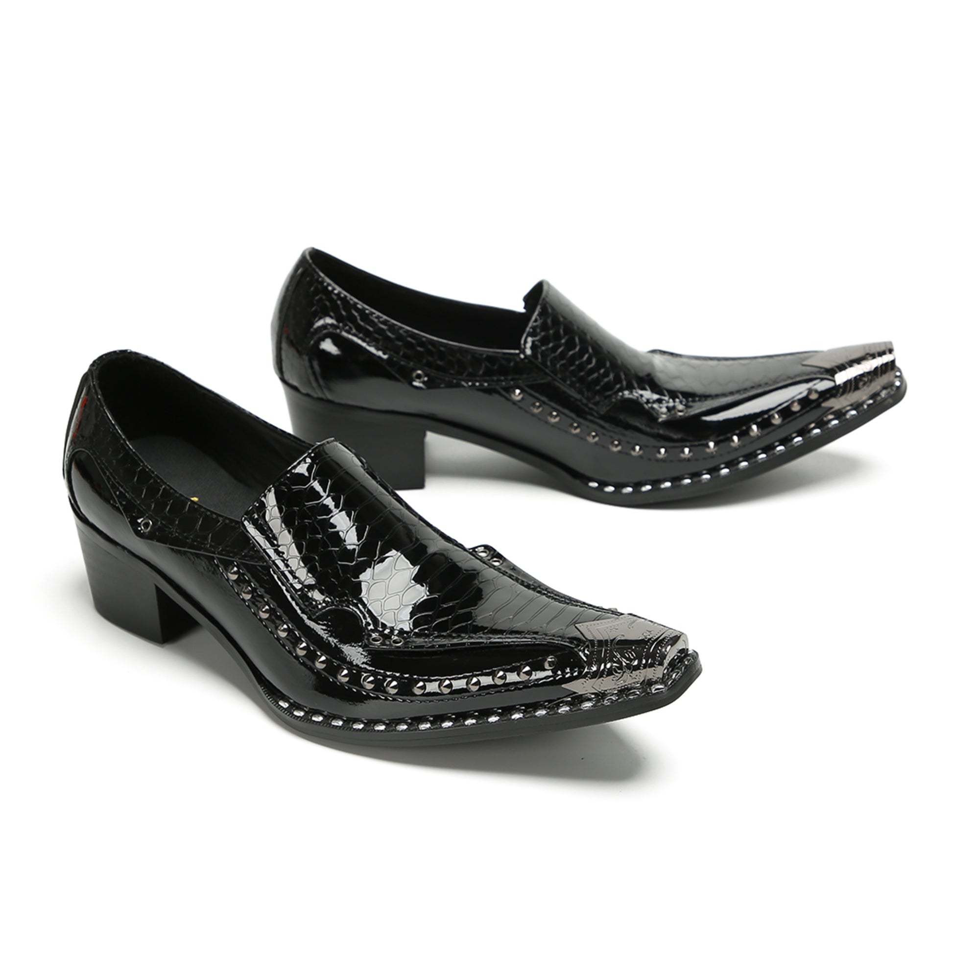This pair of sleek, black slip-on loafers showcases a high-shine patent finish. They feature a striking crocodile-embossed texture on the vamp and heel counter, contrasted by a smooth glossy mid-section. Silver-tone studs adorn the edges, leading to a prominent pointed toe capped with a matching metallic accent, all set on a sturdy block heel.