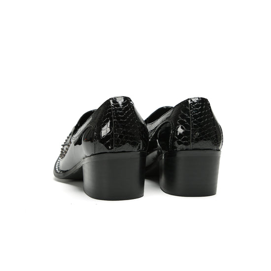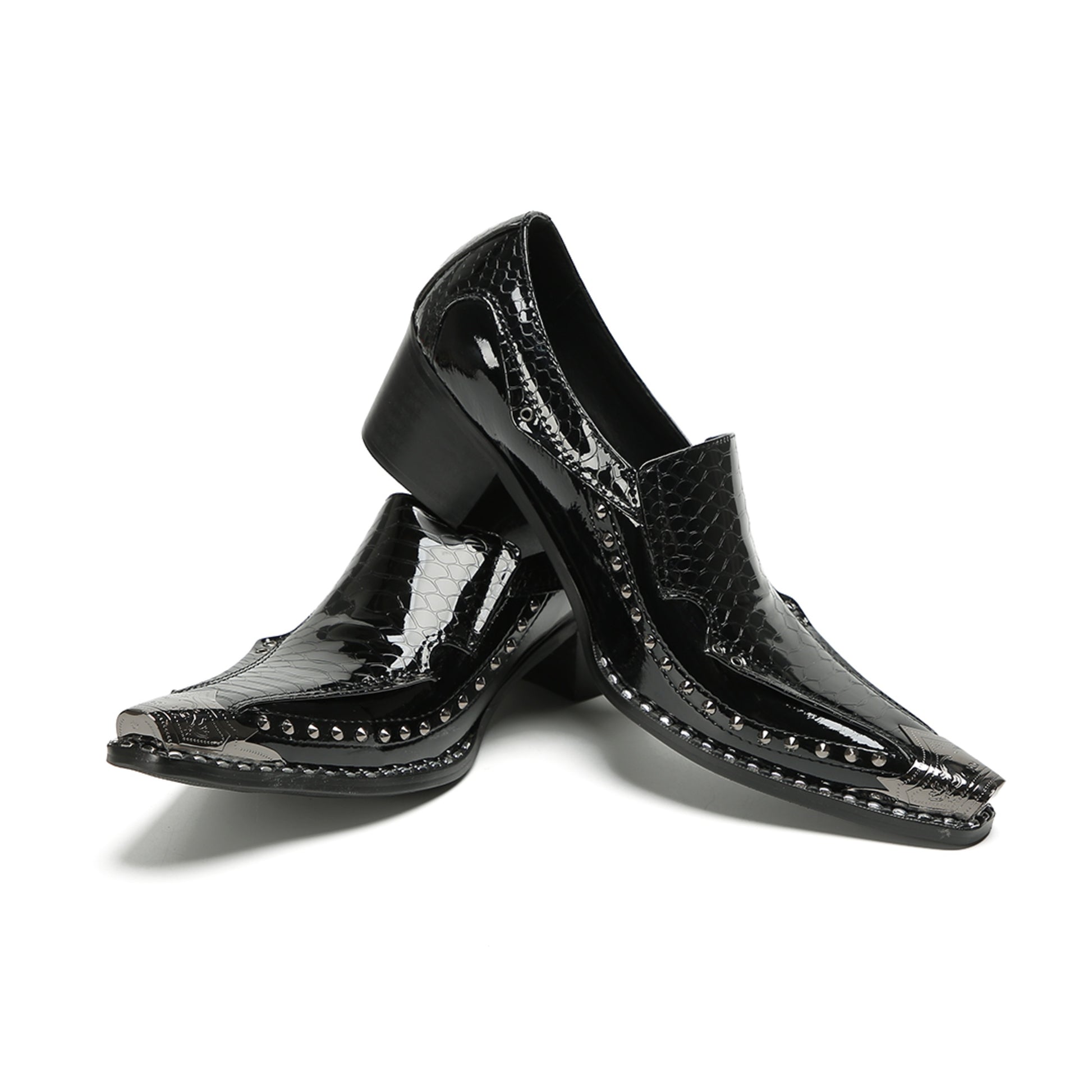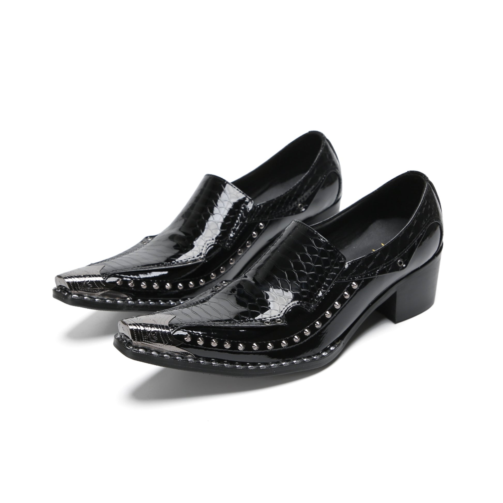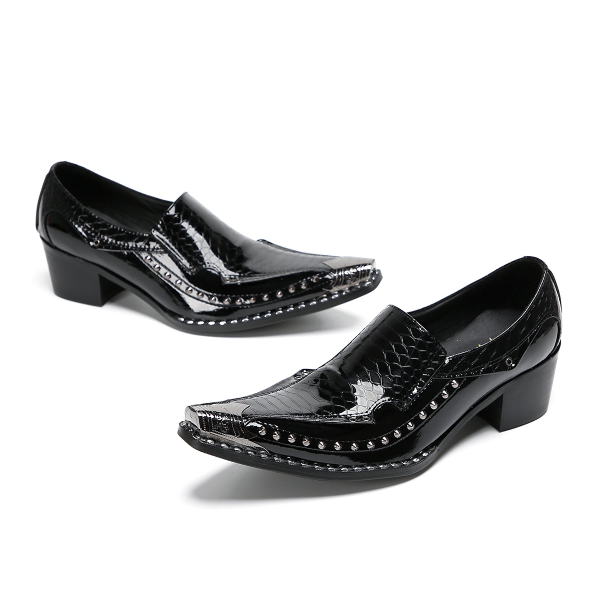 This pair of sleek, black slip-on loafers showcases a high-shine patent finish. They feature a striking crocodile-embossed texture on the vamp and heel counter, contrasted by a smooth glossy mid-section. Silver-tone studs adorn the edges, leading to a prominent pointed toe capped with a matching metallic accent, all set on a sturdy block heel.