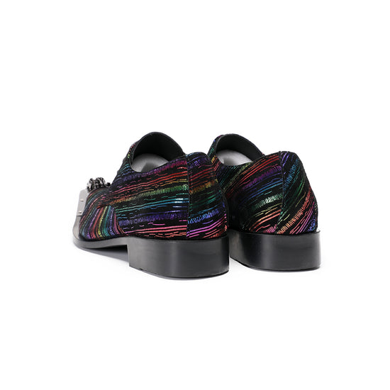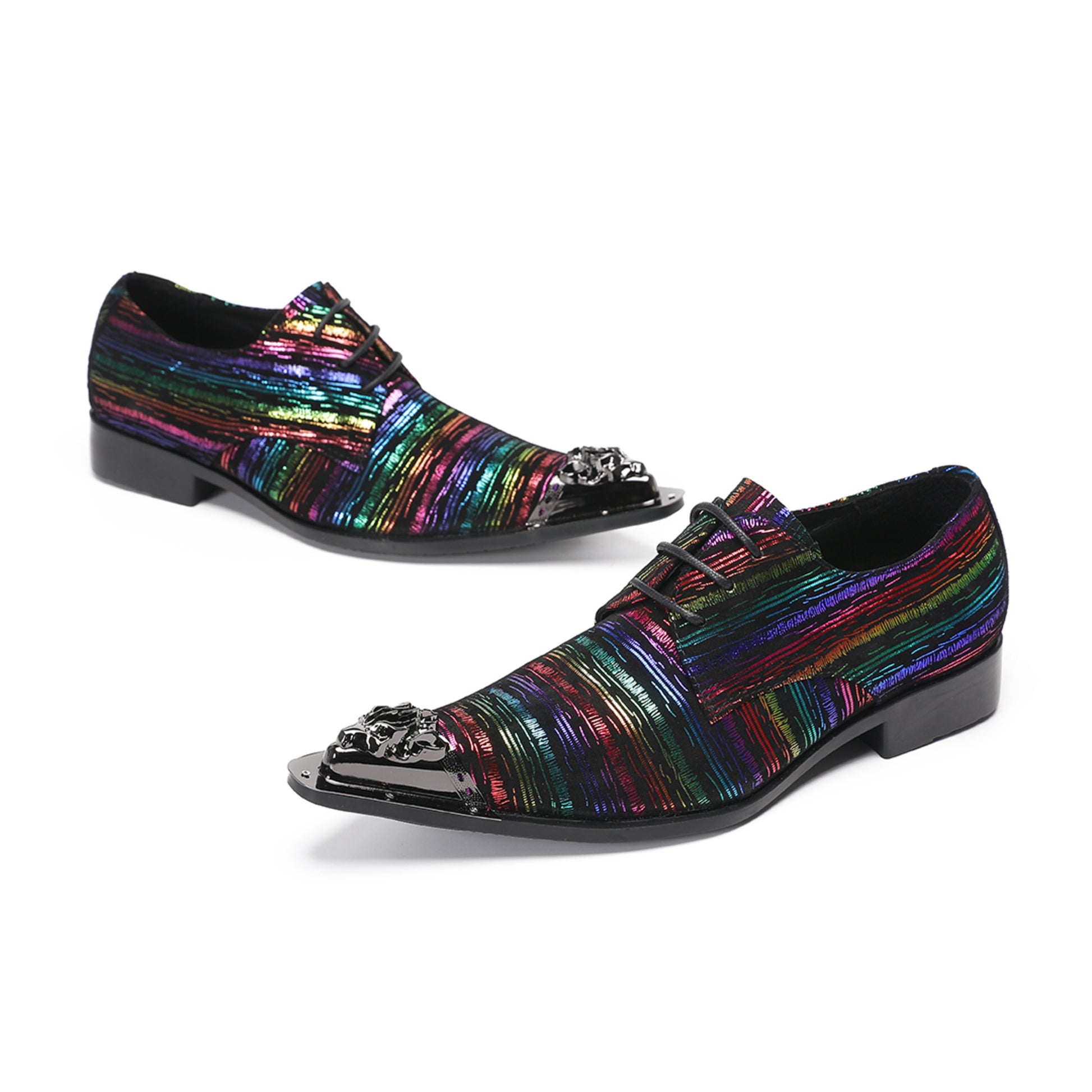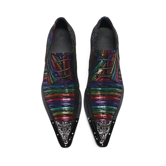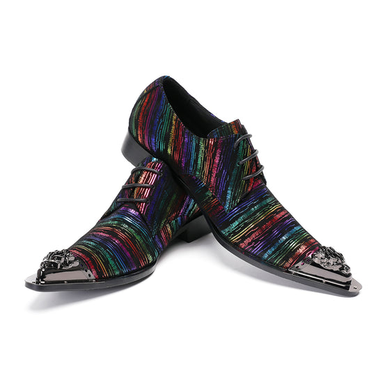 These striking oxford shoes boast a vibrant, multicolored striped pattern across their upper, creating a dynamic, shimmering effect. The intricate lines feature a metallic finish, catching the light with every movement. A prominent, ornate gunmetal toe cap adds a touch of avant-garde flair, complementing the shoe's sharp, pointed silhouette and classic lace-up design.